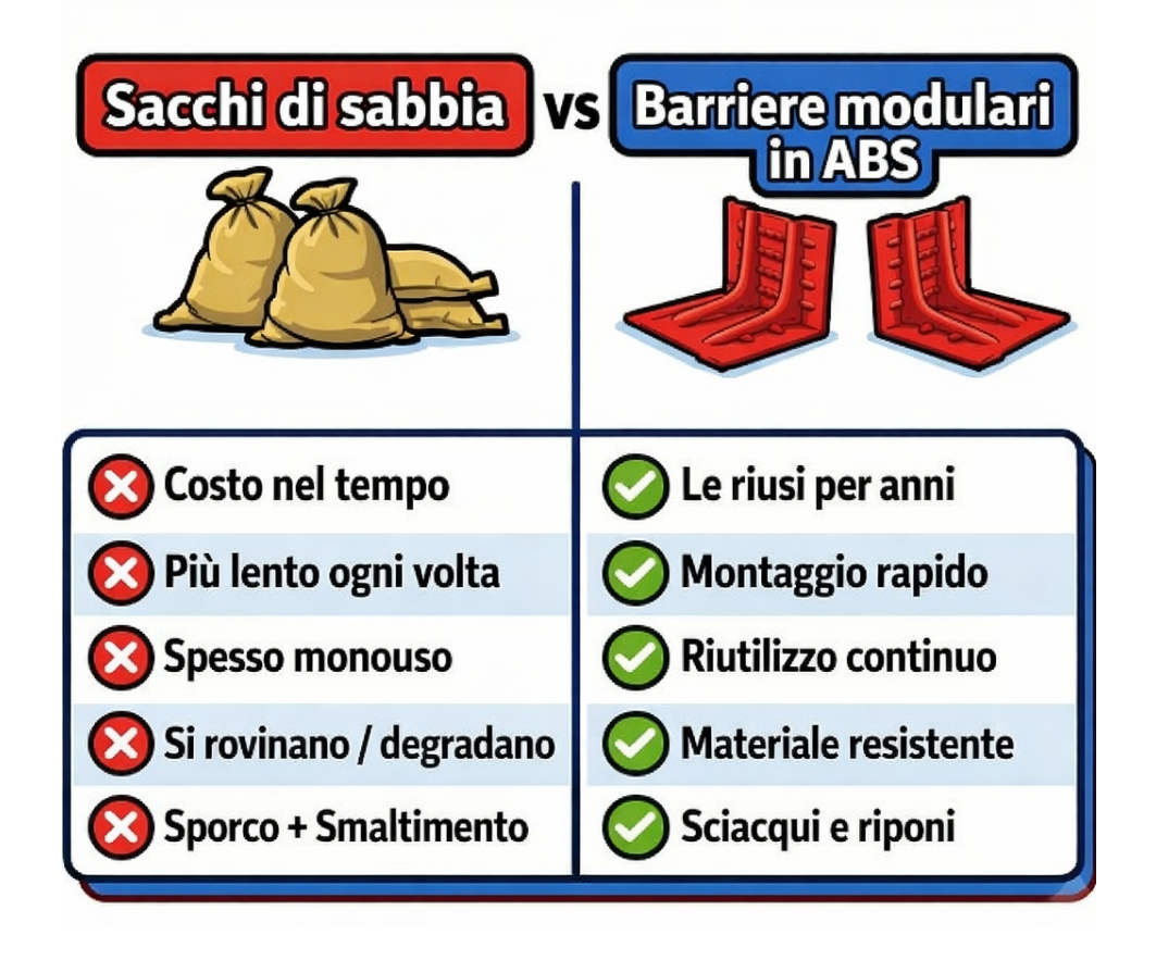 Le nostre barriere antiallagamento si installano in 5 minuti, senza attrezzi, e possono salvare la tua attività da danni devastanti.
